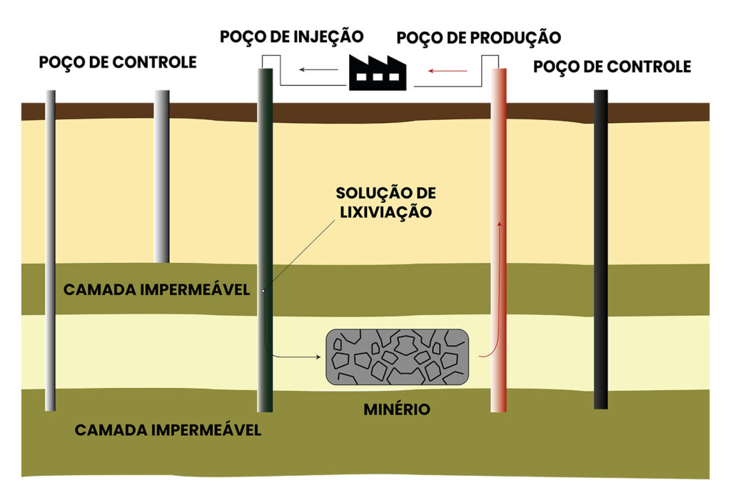 Nesse processo, a solução lixiviante é injetada no depósito mineral por meio de poços ou galerias, percola através da formação geológica e dissolve seletivamente o metal de interesse.