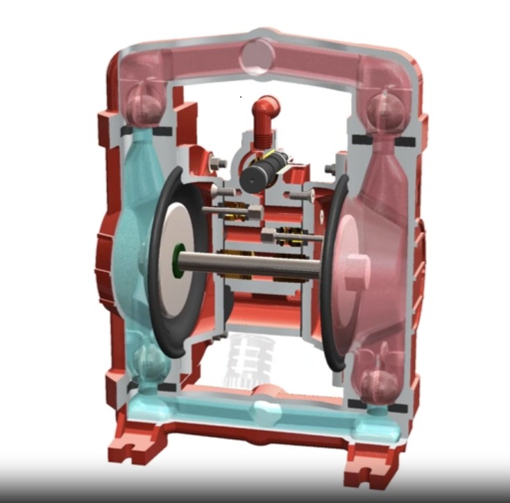 Dentro da bomba, a válvula de ar controla o ar comprimido, fazendo os diafragmas se movem para um lado e para o outro. As esferas da válvula de entrada se abrem permitindo a entrada do líquido e se fecham, enquanto as de saída se abrem permitindo a saída do líquido. Esse movimento de abrir e fechar acontece o tempo todo, e é o ar comprimido que faz tudo funcionar de forma automática.